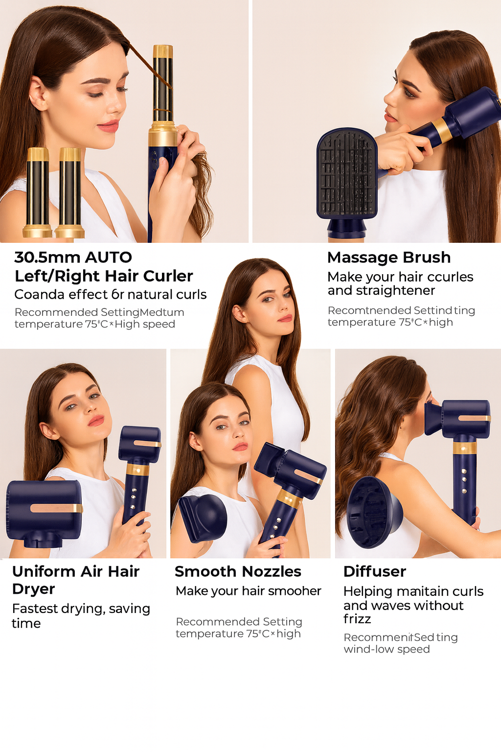 Experience effortless styling with this all-in-one high-speed brushless hair dryer set. Equipped with ionic technology, multiple brush and barrel attachments, a diffuser, and an auto-curling wand, it smooths, dries, volumizes, and curls with salon-grade precision—all in one sleek tool.